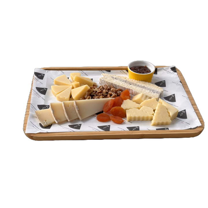 Party delight platter with Comté, Truffle Brie, Cantal and Ossau-Iraty, with walnuts and dry apricots