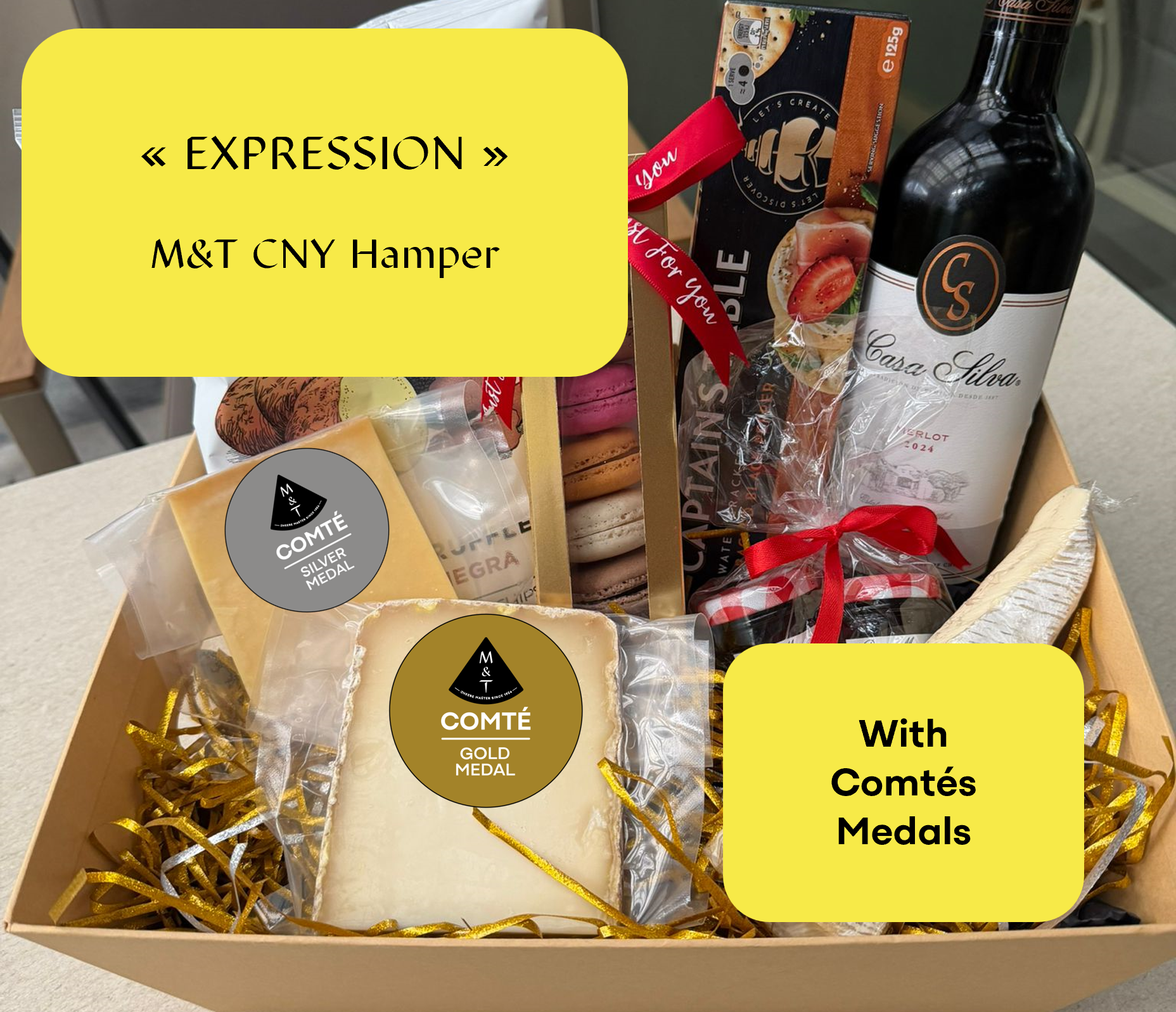 High quality celebration : M&T “Medals” Comté (Gold, Silver and Bronze), assorted with fine Chocolates, intense Fig Jam, crackers and and nice French Wine.